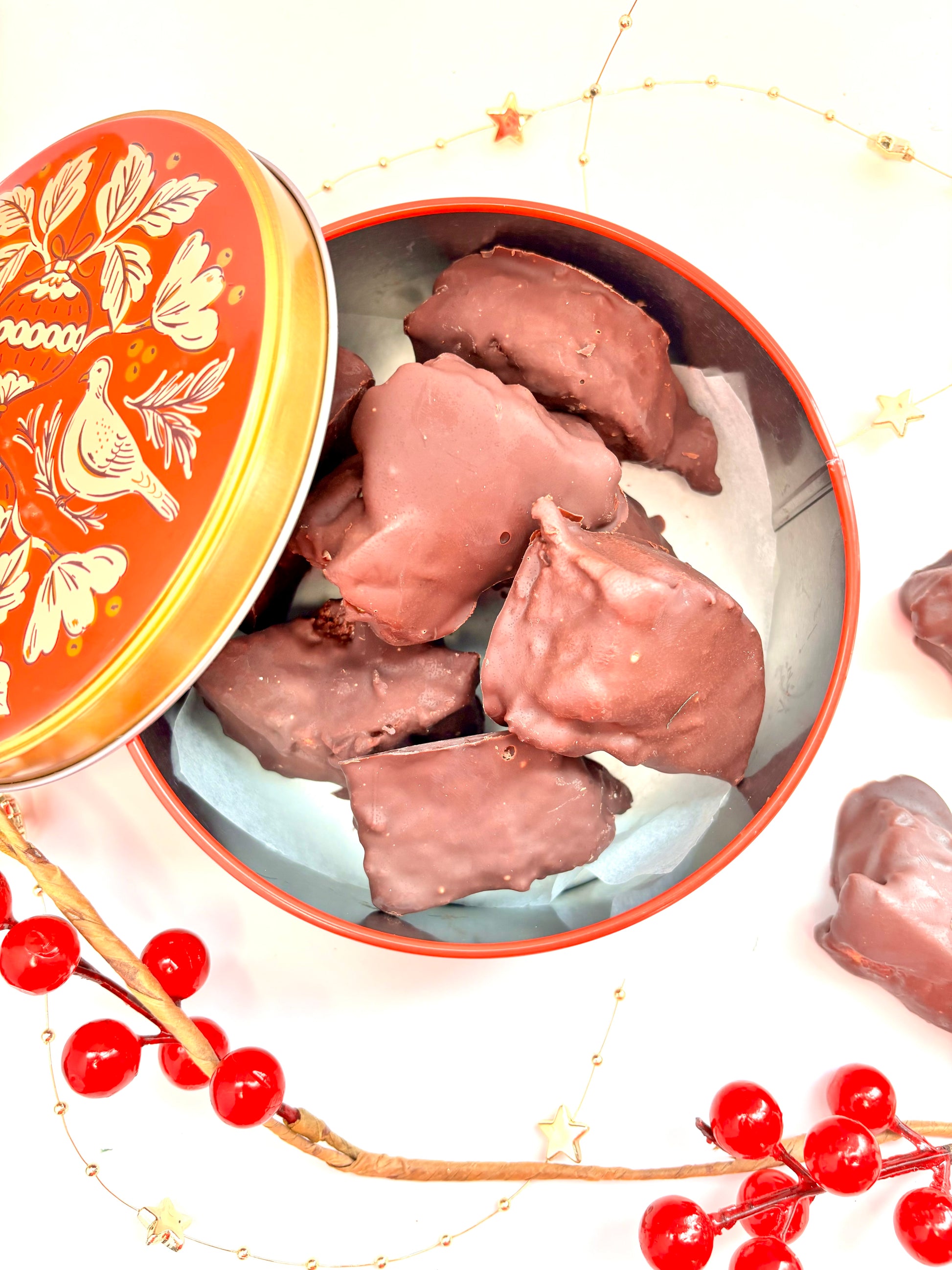 Morceaux de Panettones irrésistibles enrobes avec Chocolat belge 54% dans un magnifique emballage cadeaux réutilisable.